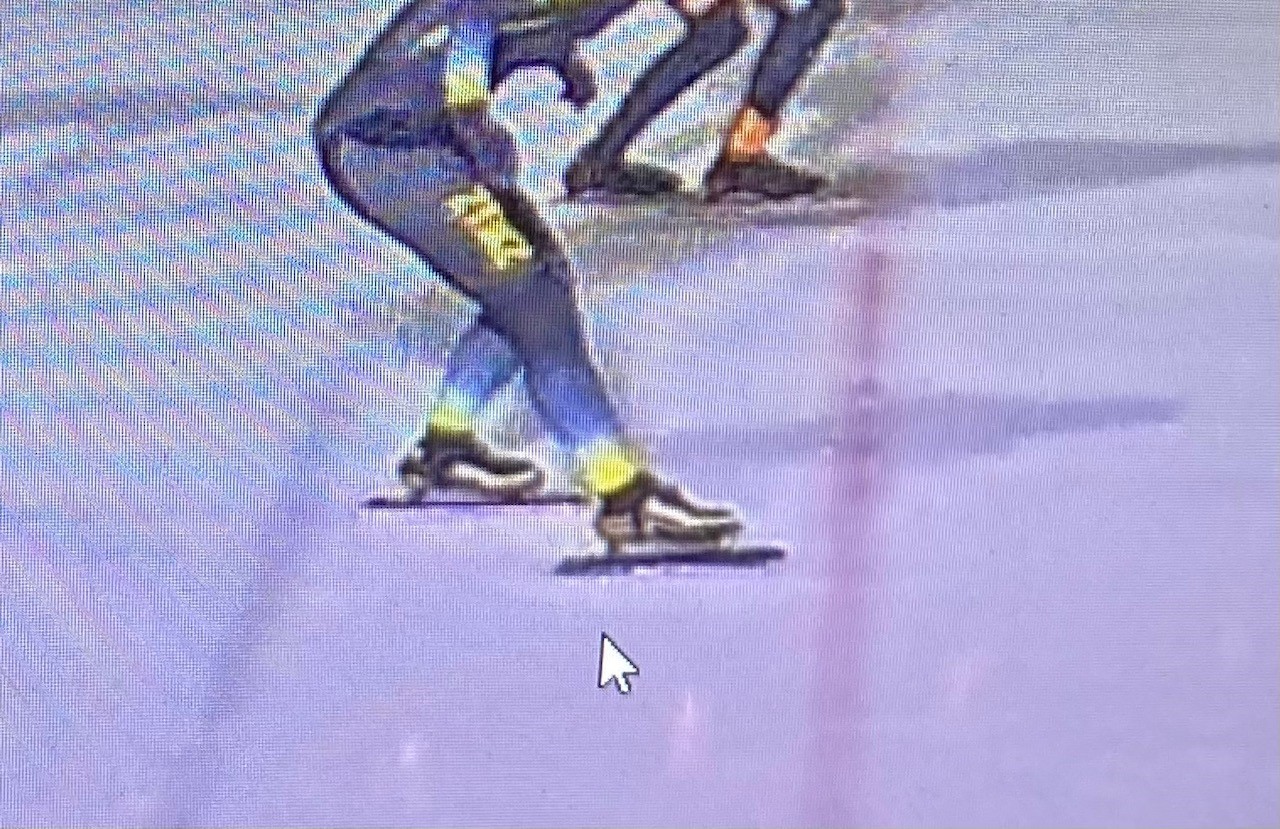 Voor elke wedstrijd geef ik vaak nog wat korte mededelingen. De belangrijkste: geen kleding in de bocht leggen. Ook herinnerde ik deze keer aan artikel 420.10.b: de uiteinden van de schaats moeten afgerond zijn met een straal van 1 cm — ongeveer een munt van tien cent.