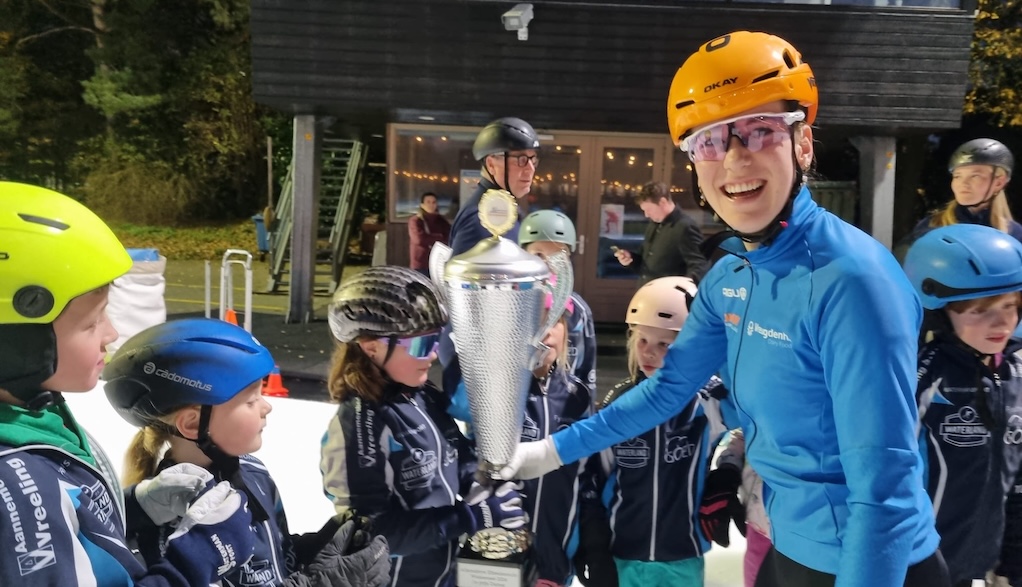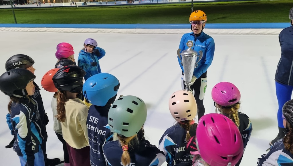 We kregen bovendien bijzonder bezoek van marathonschaatser Tessa Snoek. Zij vertelde de kinderen dat ze op de Weissensee maar liefst 200 kilometer heeft geschaatst – dat zijn zo’n 500 rondjes op de Jaap Edenbaan! Tessa had haar enorme beker bij zich die ze daar heeft gewonnen, en die maakte natuurlijk grote indruk op de jonge schaatsers.